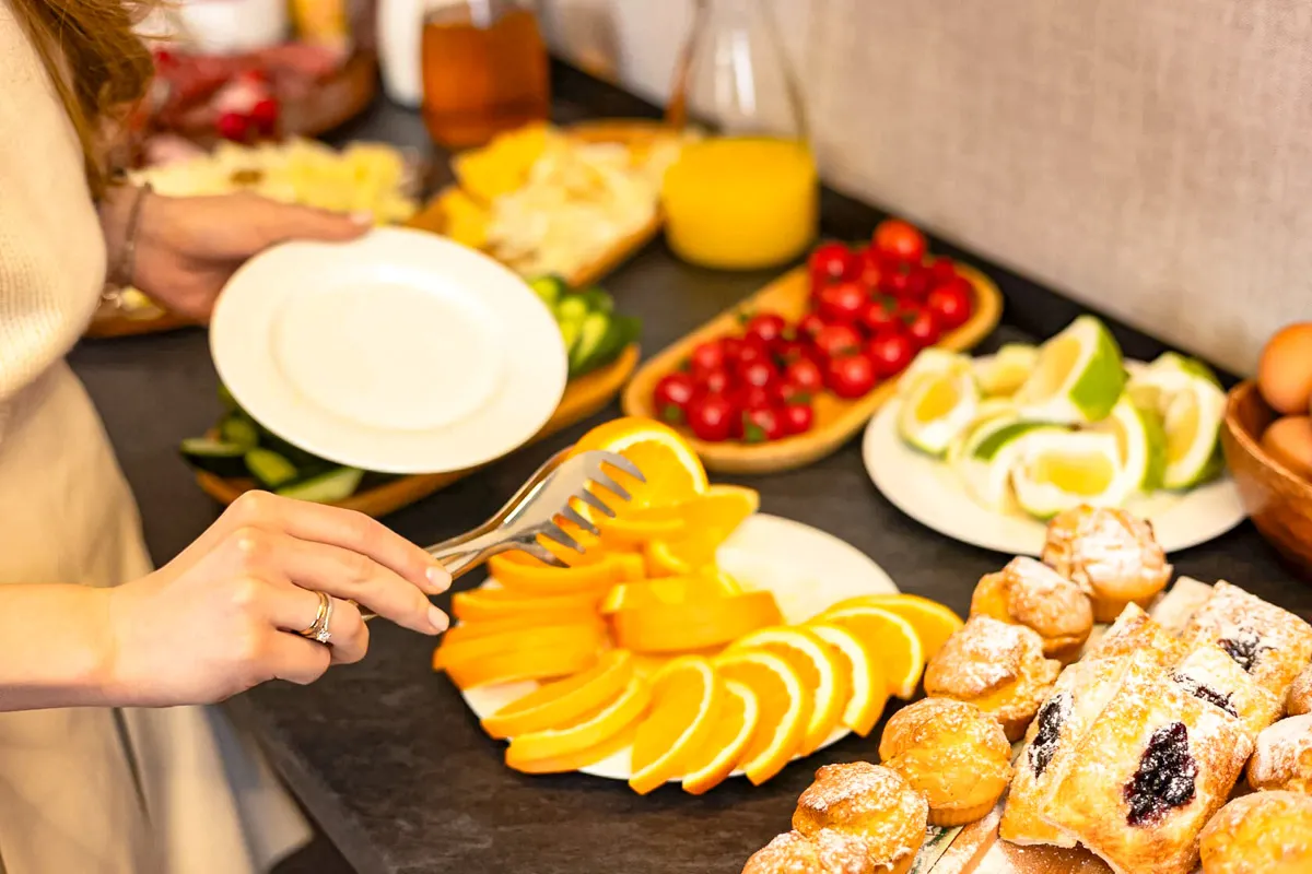 Питание для гостей отеля «Агат» г. Кисловодск предоставляется в виде комплексных завтраков. Вам будут предложены несколько вариантов блюд и напитков, чтобы вы могли выбрать то, что привыкли есть на завтрак, или попробовать что-то новое. В приготовлении еды используются продукты местного производства, поэтому на отдыхе вы будете есть экологически чистые и полезные блюда. Завтраки проходят в столовой гостиницы с 8:00 до 10:00. Помещение оформлено в стилистике отеля: это преобладающие светлые тона и удобная современная мебель.