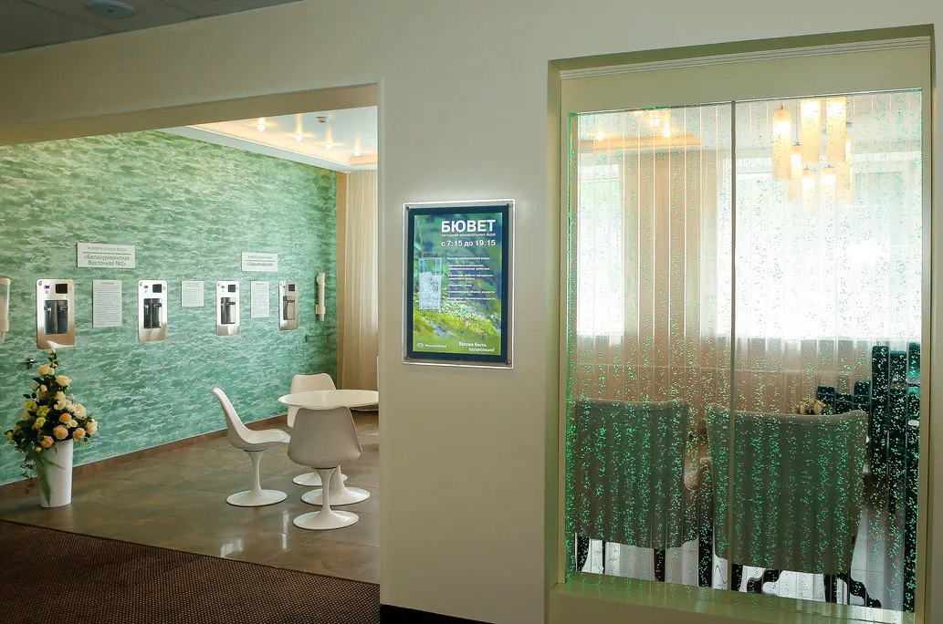 - Питание в четырех форматах. В обеденных залах действуют системы «шведский стол» и «заказное меню». Также в рационе присутствуют диетические и детские блюда с дополнительными полдниками. Питание 3-разовое с 2-часовыми трапезами. На территории санатория работают лобби-бар и фито-бутик.