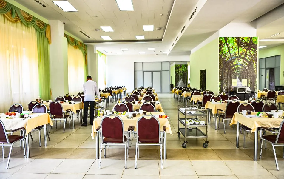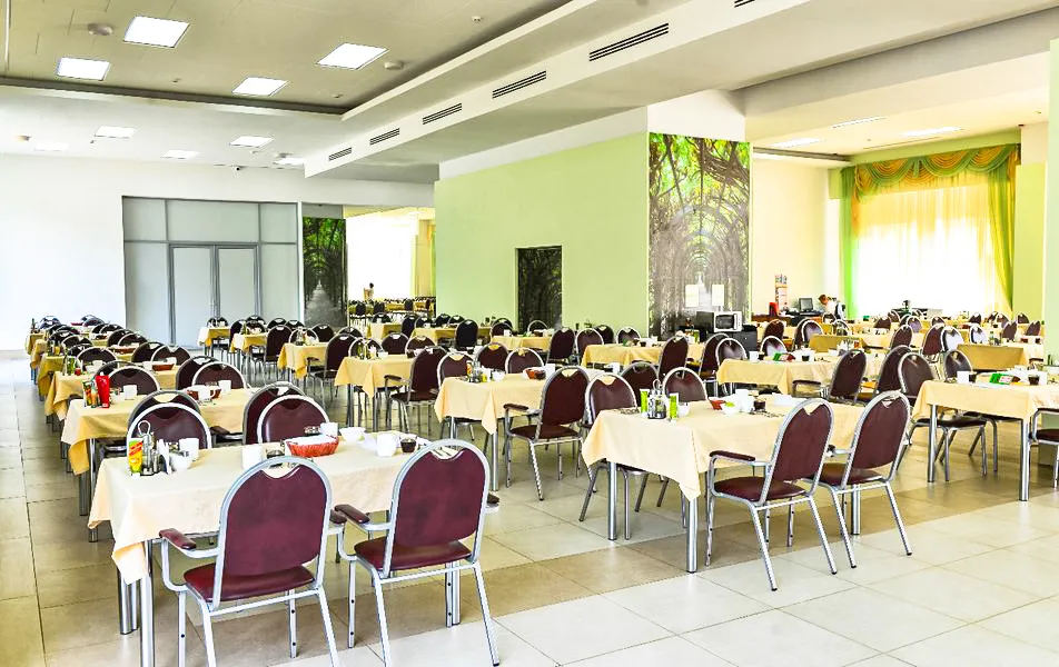 Зал на 200 мест предусматривает 4-местные столики, питание по принципу меню-заказ в рамках назначенной лечащим врачом диеты. Здесь также предоставляется «дежурное блюдо» в случае отсутствия заказа от гостя. Все блюда готовятся непосредственно в санатории из продуктов местного производства, поэтому вы будете есть только свежеприготовленную еду с максимальным количеством витаминов и микроэлементов.
