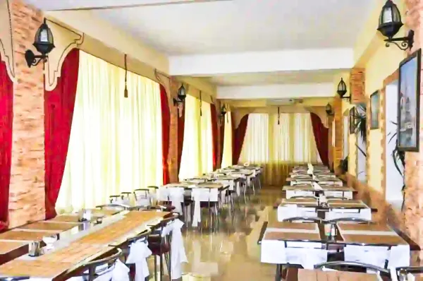 Кроме просторного зала летом здесь работает летняя площадка, что позволяет принимать пищу на свежем воздухе в окружении зелёных насаждений. Стоимость питания не входит в стоимость номера, поэтому выбрать свой вариант можно за два часа до начала работы шведского стола. Один приём пищи на человека имеет отдельную стоимость, которую можно уточнить у персонала. Дети до 5 лет обслуживаются в кафе совершенно бесплатно.