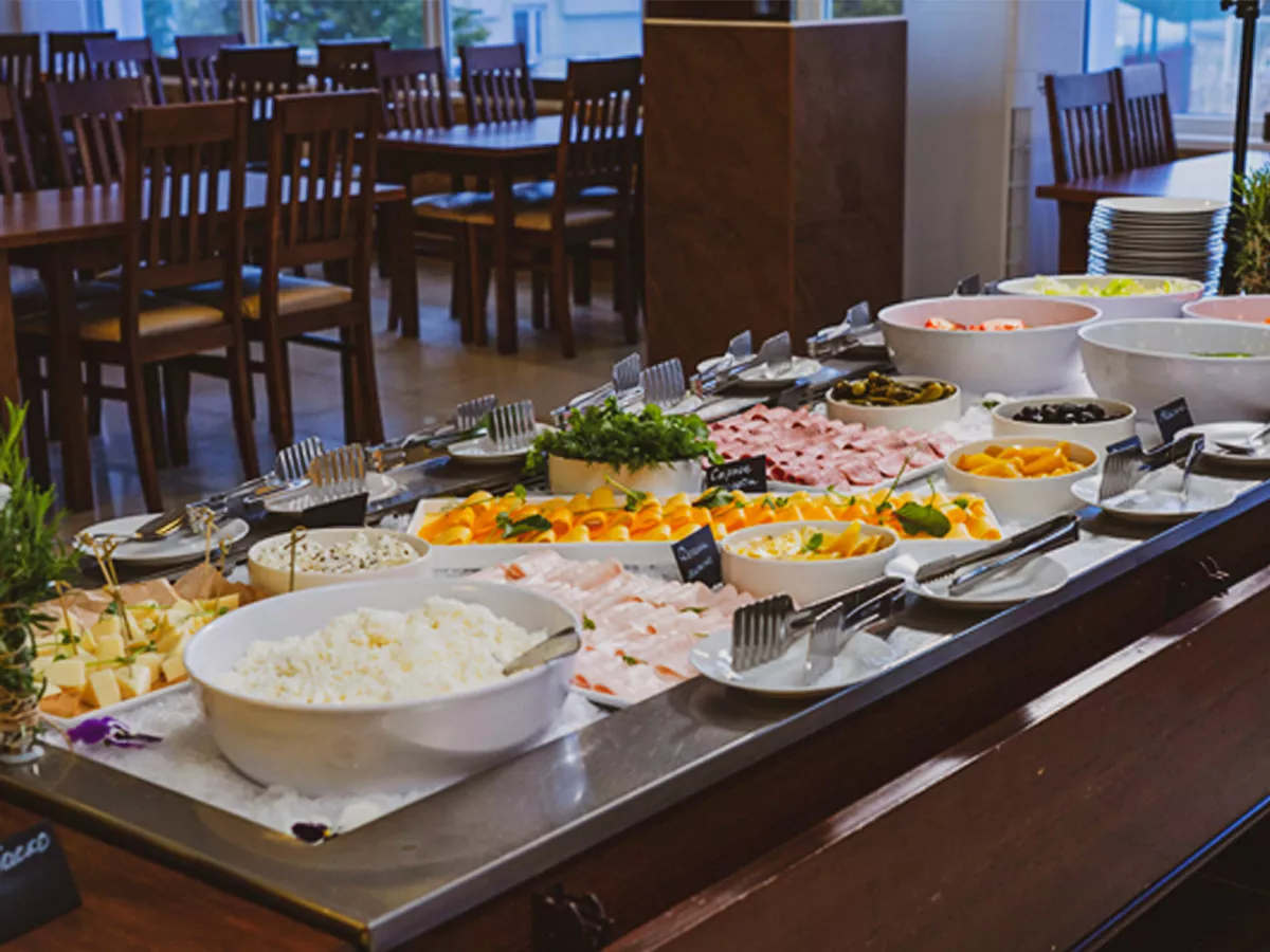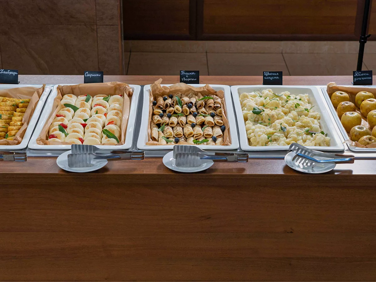 В отеле «Азимут Прометей Небуг» г. Туапсе предоставляется несколько вариантов питания. Вы можете выбрать путевку без питания, завтраки, обеды + завтраки, завтраки + обеды + ужины. Все варианты предоставляются по системе «шведского стола». В меню будет несколько вариантов блюд, из которых вы сможете сформировать себе приём пищи. Для детей готовится специальное меню. В рационе всегда представлены овощи и фрукты, мясные и рыбные блюда, есть каши, молочные и кисломолочные продукты.