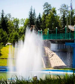 - Большой бассейн. В здравнице Алтая работает просторный плавательный бассейн размером 25×9 метров. Дно в нем создано с перепадами, поэтому глубина резервуара варьируется от 200 до 450 см. Вода в бассейне регулярно очищается и поддерживается комнатной температуры для комфорта посетителей.