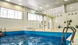 - Большой бассейн. В здравнице Алтая работает просторный плавательный бассейн размером 25×9 метров. Дно в нем создано с перепадами, поэтому глубина резервуара варьируется от 200 до 450 см. Вода в бассейне регулярно очищается и поддерживается комнатной температуры для комфорта посетителей.