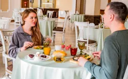 Все блюда в здравнице имеют умеренную калорийность и содержат оптимальное количество белков, жиров и углеводов. Трапезы проходят в ресторане с 4 залами, где находится 840 посадочных мест. Там проводятся гастрономические выставки с возможностью дегустации. Лучшие из наименований определяются посетителями и включаются в ежегодное меню. Каждый месяц шеф-повара совместно с технологами устраивают дни экспериментальной и национальной кухонь. А на ежедневной основе гостям предлагается несколько базовых форматов питания.