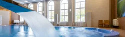 - Акватермальный комплекс. Гости санатория приглашаются на расслабляющие сеансы термотерапии в финскую сауну, турецкий хамам и соляную аромасауну. Имеются открытый и крытый бассейны с элементами аквапарка – водопадом, гейзером и горками. Температура воды поддерживается в пределах +26-29 ℃.