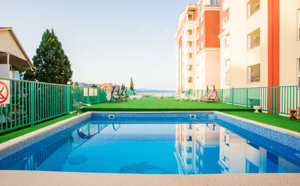 - В пансионате развитая инфраструктура с подогреваемым бассейном, игровой детской площадкой, гриль-баром и террасой-солярием.