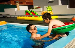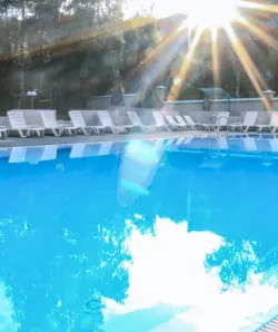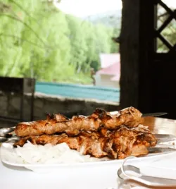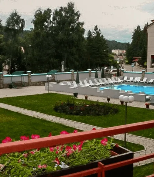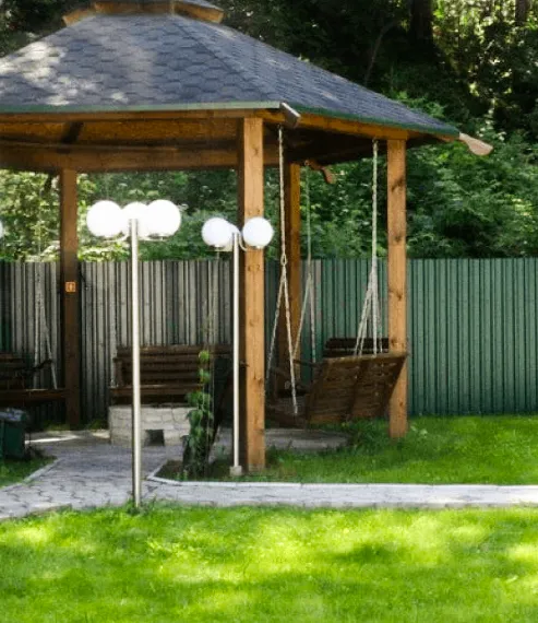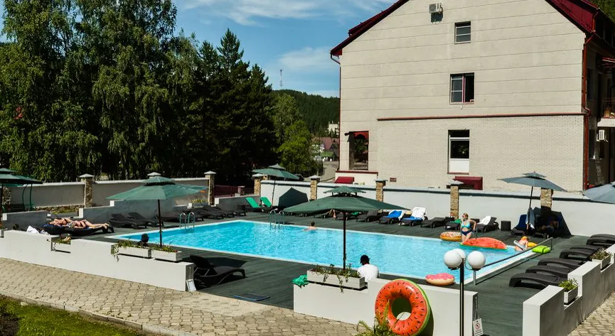 Рядом с гостиничным комплексом имеется летний бассейн глубиной 1.5 метра и температурой 26-28 °С, а вблизи него располагается просторная беседка для приятного отдыха большой компании – в ней установлены подвесные качели и очаг из натуральных камней. Для его использования предусмотрены дрова, уголь, спички и жидкость для розжига. Эти атрибуты пригодятся и для мангала, скрывающегося в тени хвойного леса: на свежем воздухе туристам можно самостоятельно приготовить шашлыки и различные блюда на гриле. Для их дегустации рядом находятся посуда, салфетки и скатерть на стол.