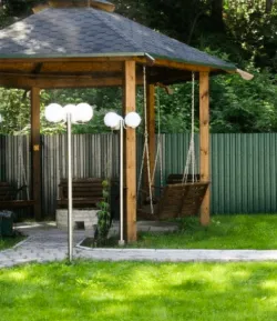 - Отдых на природе. Гостям предоставляется просторная беседка с подвесными качелями и каменным очагом. Рядом имеются дрова, уголь, спички и жидкость для розжига. Они пригодятся и для мангала, на котором можно приготовить шашлык и блюда на гриле. Рядом находятся посуда, салфетки и стол со скатертью.