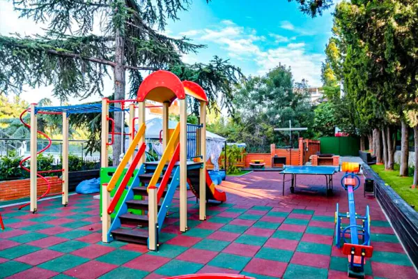 Для самых маленьких отдыхающих есть отдельная игровая зона со всеми необходимыми элементами. Здесь можно покататься на качелях и каруселях, полазать на горках, построить песочные замки и многое другое.