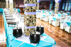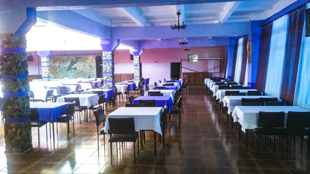 В пансионате «Голубой залив» в Феодосии предлагается 3-х разовое питание в Столовой по системе «шведский стол». Гостям подаются блюда собственного производства российской, европейской кухни. В обеденном зале на 500 человек установлены раздаточные столы, всегда готовы помочь услужливые официанты.