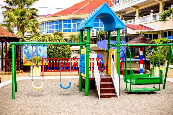 На свежем воздухе также обустроена игровая площадка для юных гостей, где есть качели, песочница, лесенки и другие элементы. В пансионате для малышей и школьников работает детская комната, где им предлагаются настольные игры, познавательные книжки и сказки, наборы для рисования и лепки, мультфильмы, конструкторы, куклы и другие игрушки. В комнате установлены игровой домик-лабиринт, миниатюрные столы и стулья, доски для записей, мягкие ковры. В летний сезон проводятся увлекательные анимационные шоу-программы для ребят.