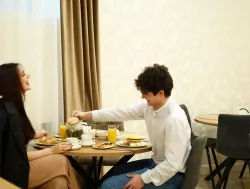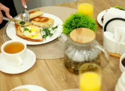 Отель «Григ’с» г. Кисловодск предоставляет для своих отдыхающих английские завтраки в рамках проживания. В такой прием пищи может входить несколько вариантов каш, яичница, выпечка с маслом (булочки, сырники или блины), колбасные и сырные нарезки, сосиски, бекон, несколько видов чая и кофе. Для приготовления еды используются преимущественно продукты местного производства. При бронировании есть возможность выбрать вариант проживания без завтраков. Если вы предпочитаете самостоятельно выбирать, чем завтракать, то в шаговой доступности открыты несколько кафе, пекарен и ресторанов.