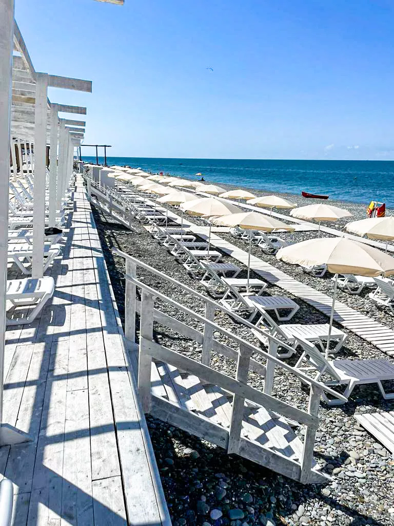 - Наличие собственного пляжа с раздевалками, душевыми и уборными