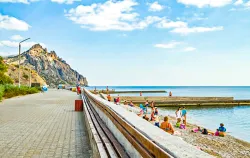 Расстояние до моря от пансионата «Крымское приморье» составляет всего 50-200 метров. Пляж галечный, очень удобный заход в воду. Прибрежные воды быстро нагреваются, тут практически не бывает штормов. Купальный сезон длится с мая по октябрь месяц. Пляж пансионата оборудован лежаками, кабинками для переодевания. За безопасностью отдыхающих следит спасательная служба.