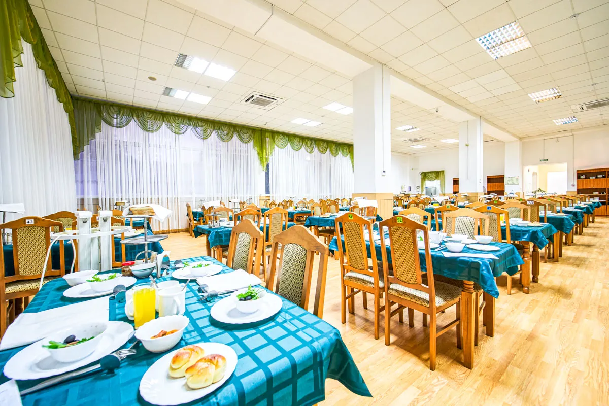 - Питание. В санатории предлагается трёхразовое сбалансированное и диетическое питание, разработанное с учетом потребностей гостей. Меню включает свежие и полезные продукты, что способствует улучшению здоровья.