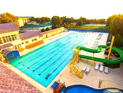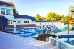 Спортивный городок – это гордость пансионата, так как здесь есть всё, чтобы играть в футбол, волейбол, баскетбол и теннис хоть каждый день. Есть поле со специальным покрытием, спортплощадка с сеткой и кольцами, а также собственный корт. Современный инвентарь и качественное освещение позволят не останавливать игру даже после захода солнца.