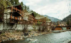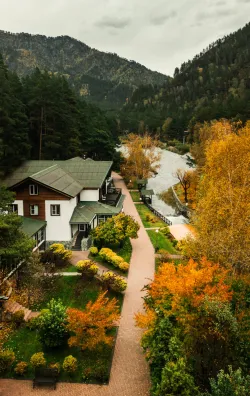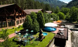 А для принятия солнечных ванн имеется открытая терраса, откуда открывается впечатляющий вид на горную реку и прекрасный ландшафт. Приятно проводить сеансы аэротерапии, вдыхая свежий воздух с высокой концентрацией ионов, фитонцидов и терпенов. Здесь замедляется время и забываются все проблемы. Человек остается в абсолютной тишине, наедине с первозданной природой.