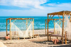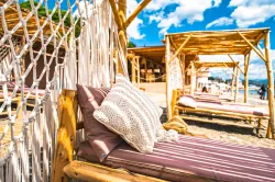 Одной из главных достопримечательностей заведения является большая пляжная территория, разделённая для удобства отдыхающих на три зоны. Такой отдых на фоне морских волн обеспечивают самые комфортабельные бамбуковые шезлонги с мягкими накладками, пуфики большого размера, а также кафе с прохладительными напитками и вкуснейшими снеками. Также здесь установлен медицинский и спасательный пункты, есть раздевалки, душ и туалет. Среди развлечений представлены все виды водного транспорта и есть возможность записаться на морскую прогулку.
