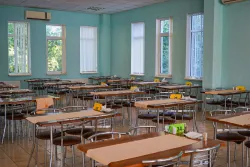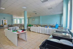 В просторной и уютной столовой гостям санатория подается основное меню. В рацион включены мясные блюда, рыба, различные гарниры, омлет, запеканки, первые блюда, салаты, зелень, овощи и фрукты, кисломолочная и молочная продукция, свежая выпечка, десерты, напитки.
