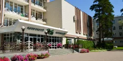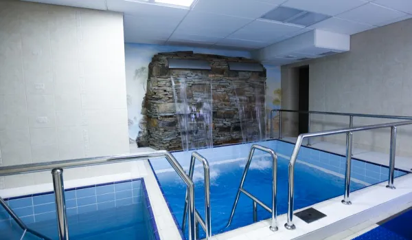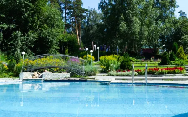 - Два бассейна. На территории здравницы находится летний бассейн, рядом играет музыка и работает кафе с прохладительными напитками. Внутри корпуса есть бассейн с плавательными дорожками. Резервуар длиной 25 м и шириной 8.5 м имеет глубину от 150 до 250 см. Вода в нем поддерживается на уровне +28°С.