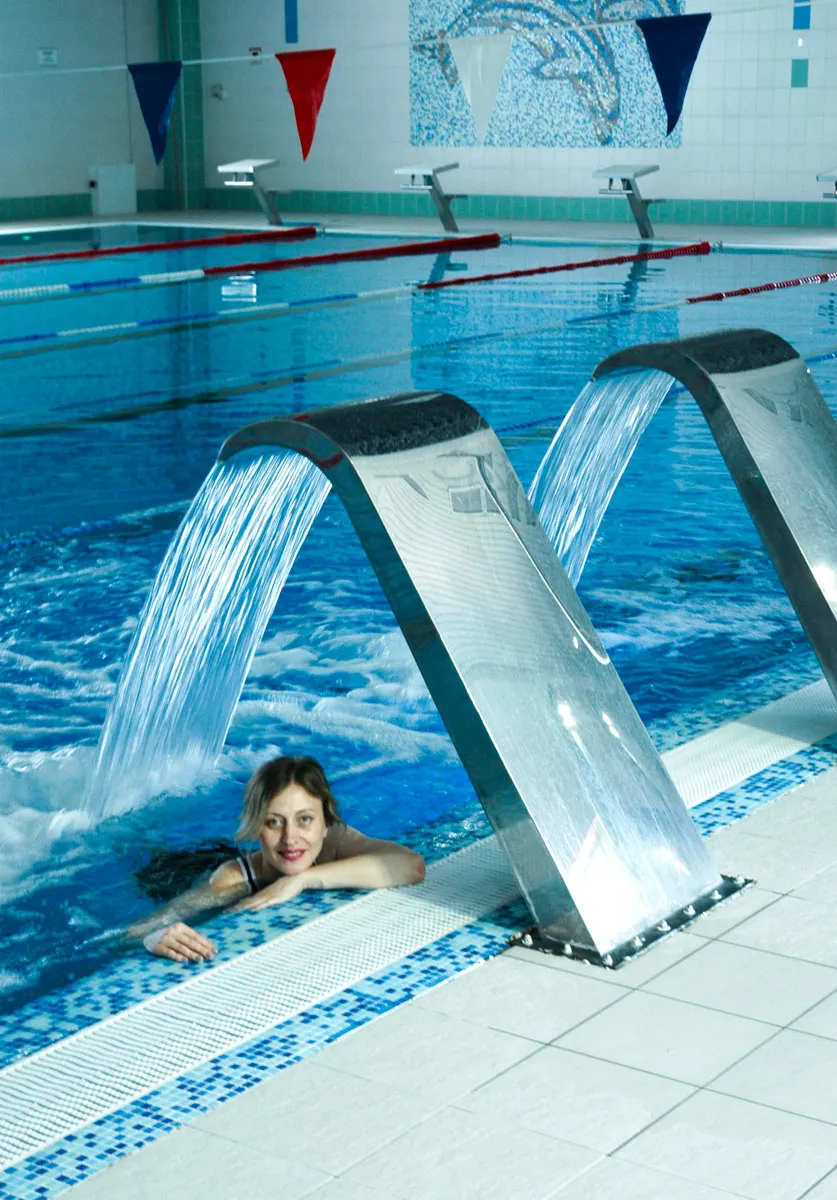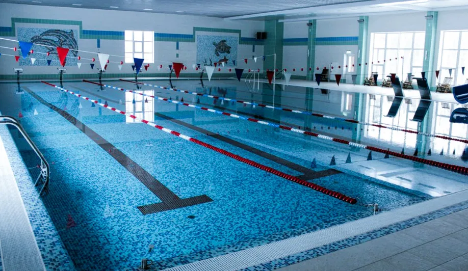 Бассейн имеет площадь 400 кв.м, длину 25 метров и ширину 16 метров, а глубина его варьируется от 120 до 220 см. Водная гладь разделена на 6 плавательных дорожек. Над поверхностью присутствует 6 стартовых тумб для прыжков вниз. В бассейне имеется несколько приятных функций: по два водопада и противотока, два тропических душа, джакузи с массажным эффектом и подсветкой, рассчитанный на 9 человек.