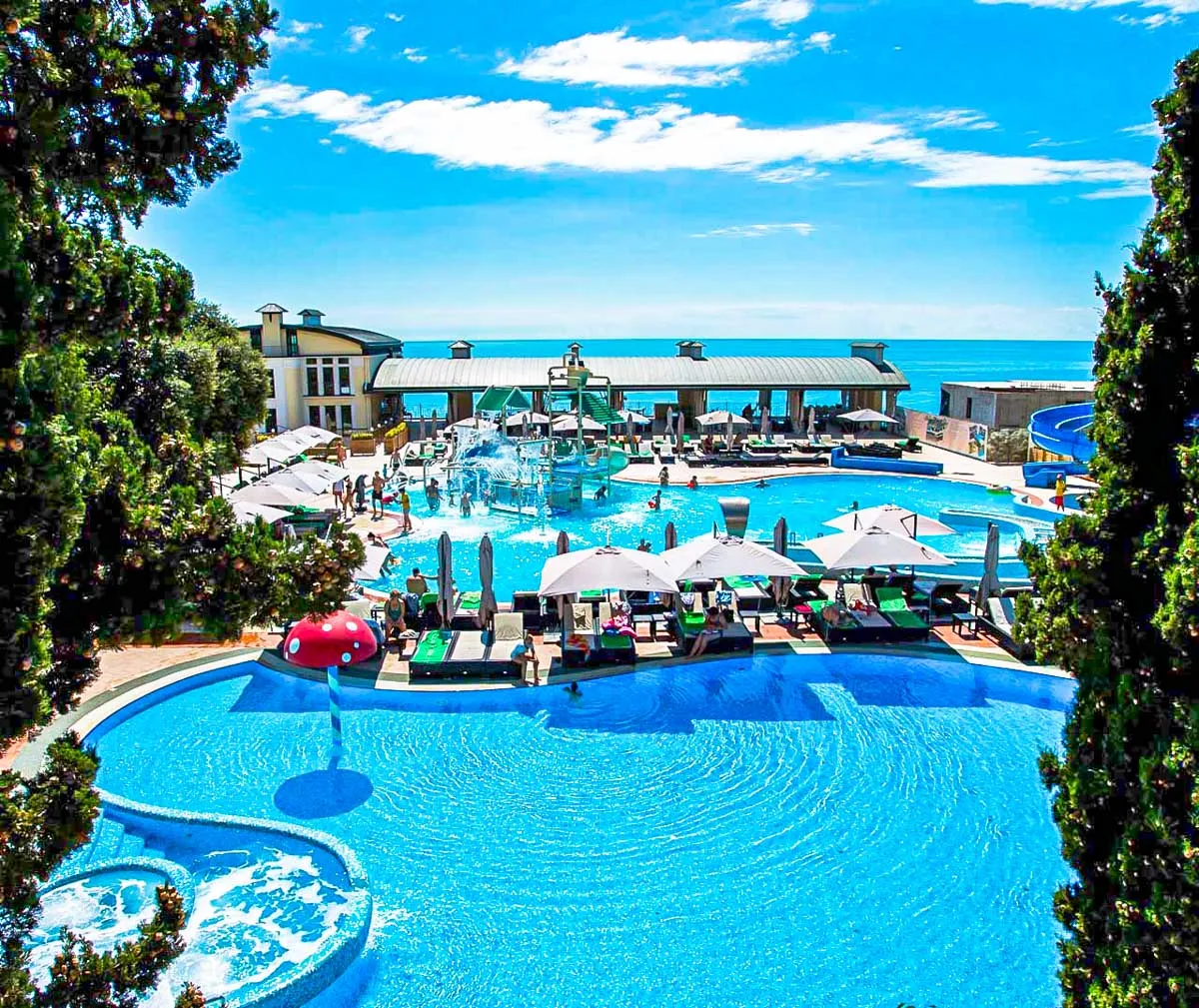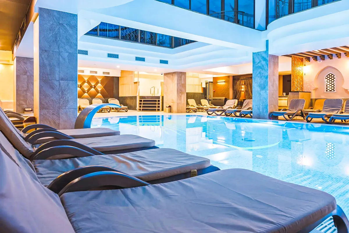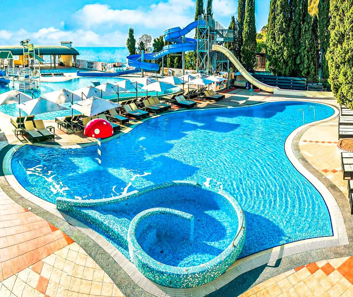 - Акватермальный комплекс: открытые и закрытые бассейны с подогревом, водные аттракционы и горки. Здесь можно расслабиться в гидромассажных зонах или почувствовать прилив адреналина на водных горках.