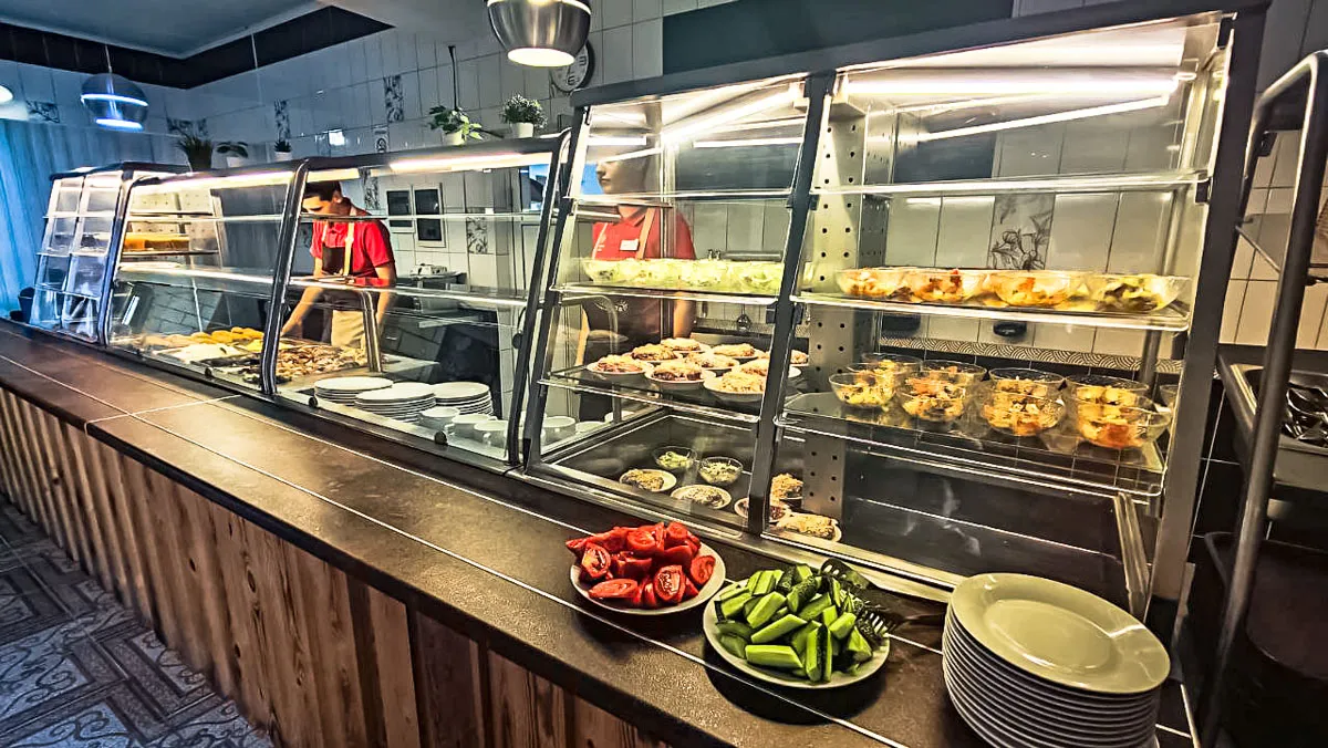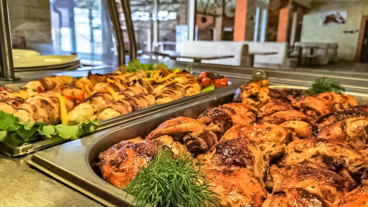 Гости пансионата могут рассчитывать на полноценное трехразовое питание в отеле по системе шведский стол или заказного меню. Линия раздачи работает с 8:00 до 19:00. В меню представлено широкое разнообразие блюд, десертов и напитков. Предлагаемое питание в пансионате сбалансированное, по-домашнему вкусное, наполненное всеми необходимыми витаминами и микроэлементами.