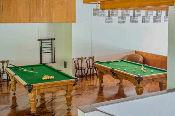 - Бильярдный зал, оснащенный профессиональными столами и панорамными окнами, создающими уютную атмосферу.