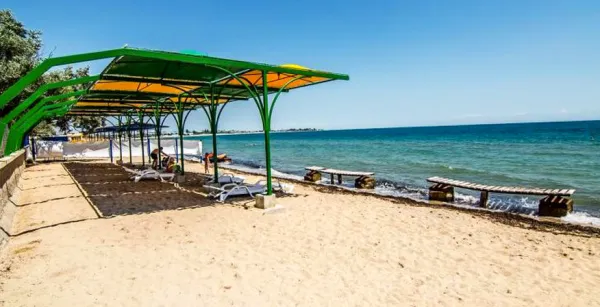 Пляж пансионата находится от корпусов всего в 50-250 метрах. Пляж оборудованный, песчаный с шезлонгами, теневыми навесами.