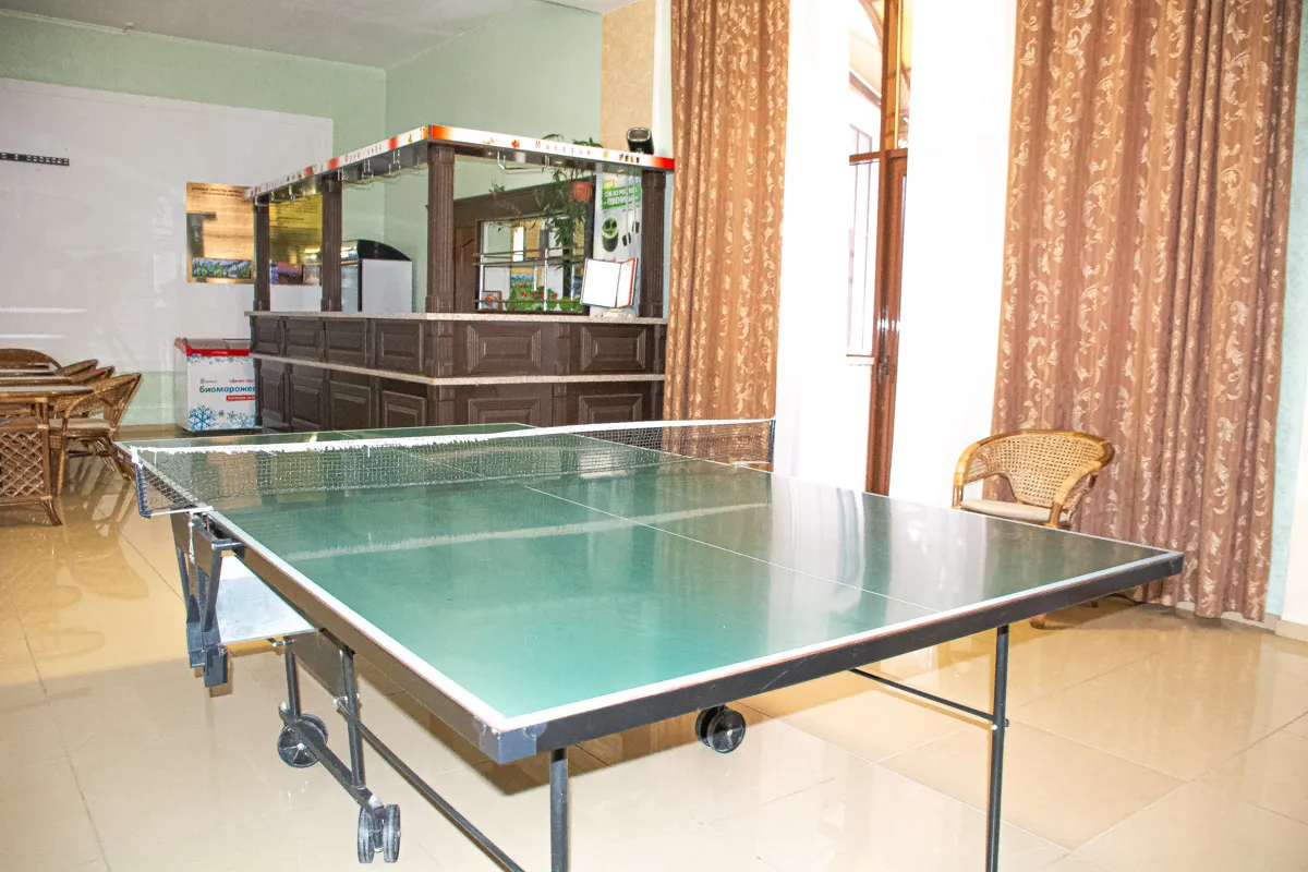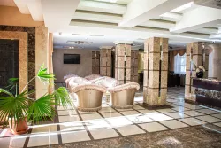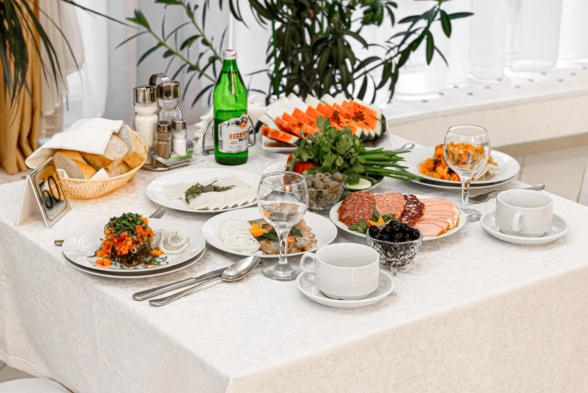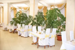В стоимость путевки включено трехразовое писание — завтрак, обед и ужин. Столовая здравницы вмещает 250 посадочных мест и представляет собой просторный светлый зал с мраморными колоннами.