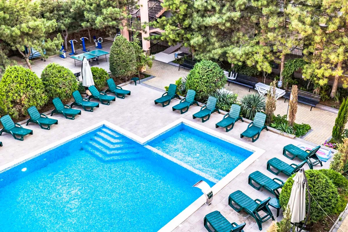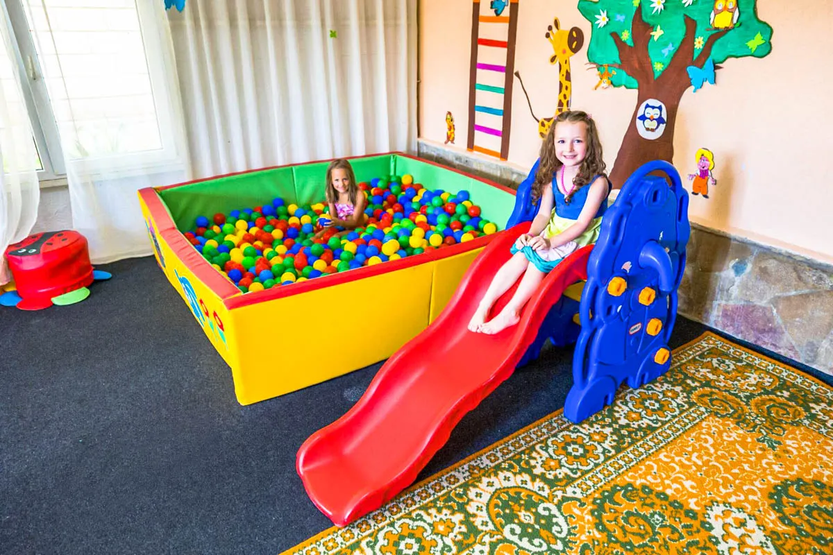 В свободном доступе открытый плавательный бассейн с чистейшей водой. На территории пансионата также есть детская площадка, игровая комната, кафе.