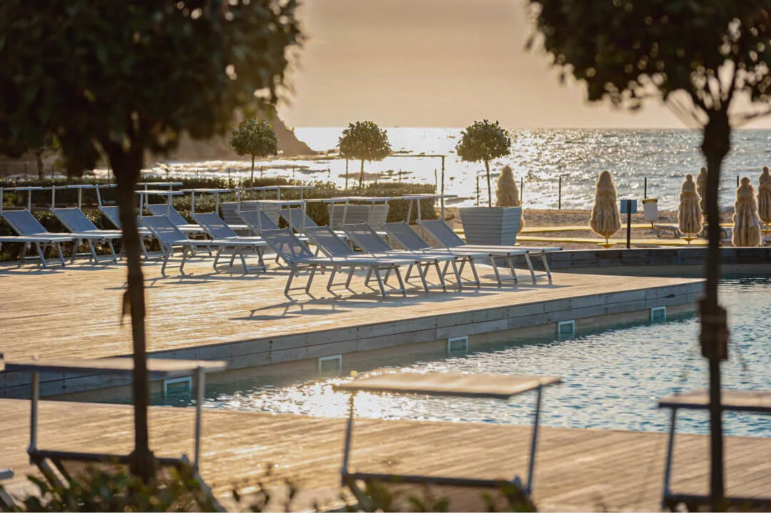 В мире «Рассветов и Закатов» гостей отеля ждет невероятный и шикарный комплекс из 5 бассейнов. На территории отеля есть большой бассейн объемом в 1500 куб. метров. Данный бассейн является одним из самых больших на полуострове. Он оснащен эффективной системой фильтрации, предусмотрен удобный спуск в воду. Большой бассейн является любимым местом для отдыха всей семьи. Рядом с бассейном установлены лежаки, зонты от солнца. Рядом расположен бар с прохладительными напитками.
