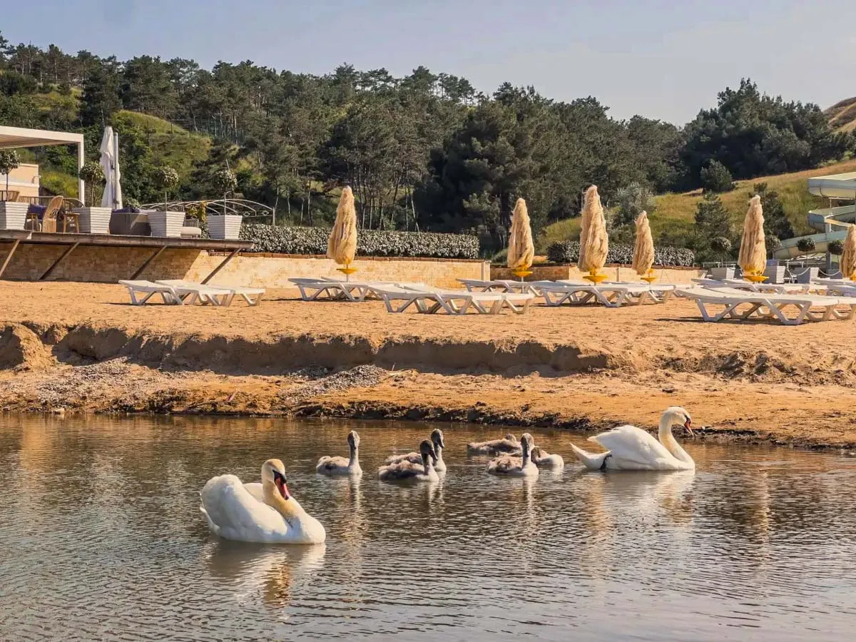На большой территории отеля имеется целый комплекс бассейнов, самый большой из которых один из самых больших в Крыму. Море положительных впечатлений подарит аквапарк, в котором предусмотрено пять горок. Для любителей активного образа жизни предусмотрены различные спортивные площадки, теннисный корт, тренажерный зал и площадка Workout. Проводятся занятия по водному поло, фитнесу.