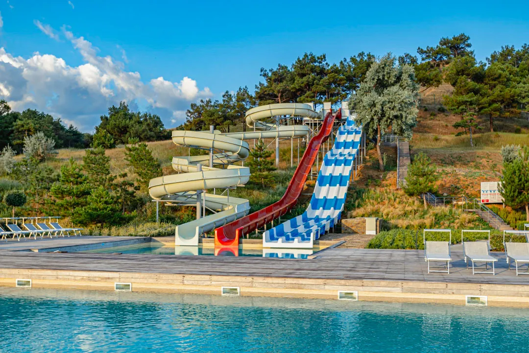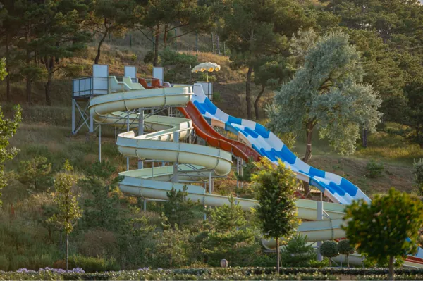 - Собственный аквапарк, состоящий из пяти горок и комплекса бассейнов. Стоимость посещения аквапарка включена в путевку.