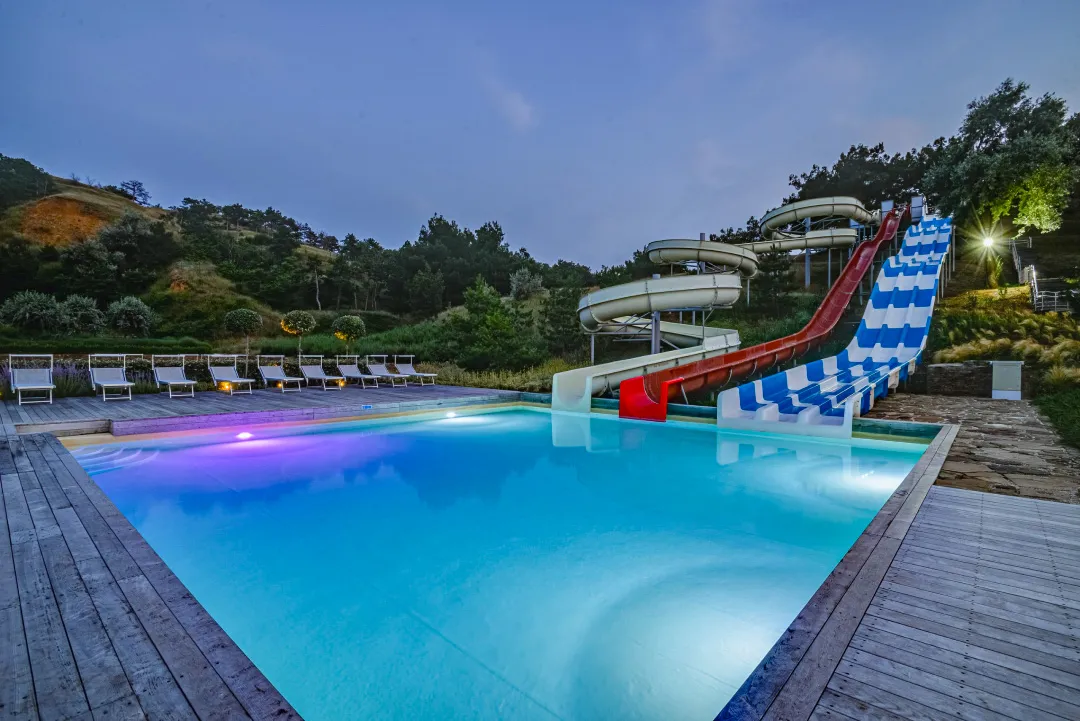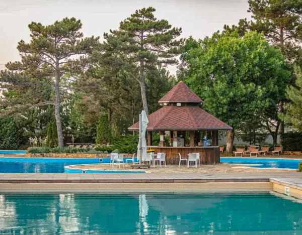 Акватермальный комплекс отеля «Рассветы Закаты» в Песчаном в Крыму представлен собственным аквапарком и аквакомплексом из пяти бассейнов, в том числе современный неглубокий бассейн с горками для самых маленьких гостей отеля. Пользование акватермальным комплексом включено в стоимость путёвки.
