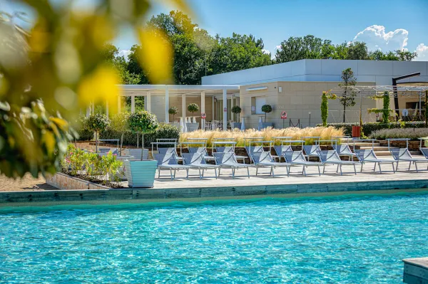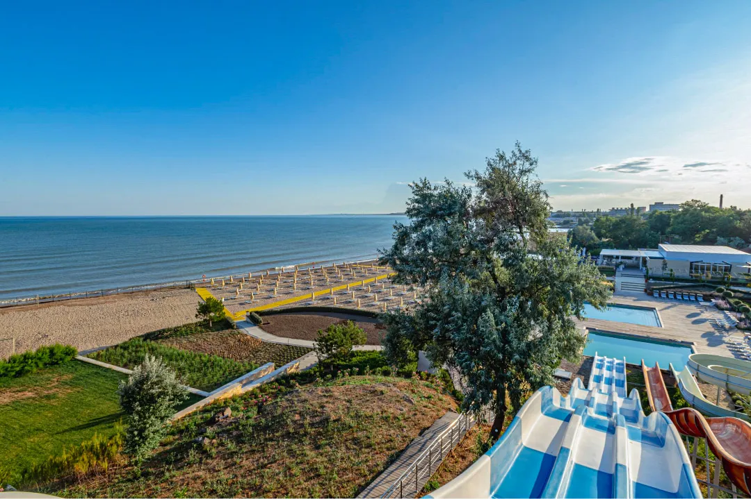 На большой территории отеля имеется целый комплекс бассейнов, самый большой из которых один из самых больших в Крыму. Море положительных впечатлений подарит аквапарк, в котором предусмотрено пять горок. Для любителей активного образа жизни предусмотрены различные спортивные площадки, теннисный корт, тренажерный зал и площадка Workout. Проводятся занятия по водному поло, фитнесу.