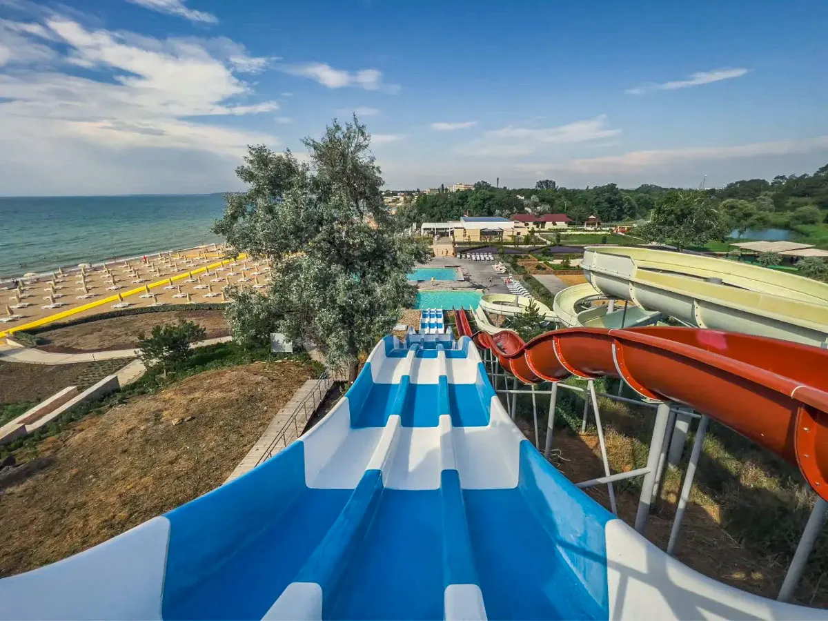 Аквапарк – это главная достопримечательность отеля «Рассветы Закаты» в Песчаном. В аквапарке установлены 5 горок, среди которых одна- скоростная, три соединенные между собой и одна – витиеватая. Горки абсолютно безопасны. На каждой горке дежурит инструктор. Внизу у бассейна за безопасность отдыхающих отвечает спасатель. Бассейн для спуска имеет современную систему очистки воды. На территории аквапарка установлены лежаки, для отдыха в промежутках между подъемами и спусками с горок.