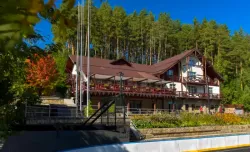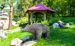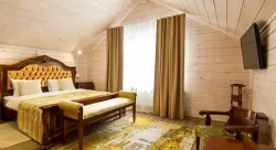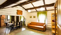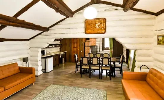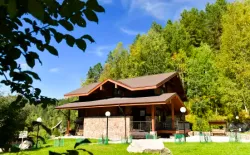 - Таёжная заимка «Лесная сказка». На поляне стоят уютные домики для размещения гостей – деревенские избы с печью, коттеджи–шале и мини-отели в виде загородных домов. Рядом есть озеро для рыбалки и катаний на лодке, шезлонги, баня, ресторан на берегу. Можно пожарить шашлыки в беседках с мангалом.