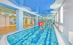 Гости приглашаются в банный комплекс, где находятся сухая баня (90°С), турецкий хаммам (+40°С) и финская сауна (+65°C). После распаривания предлагается окунуться в бассейн с пресной водой, прогретой до +26-28°С. Длина чаши составляет 12 м, ширина – 4 м, а глубина варьируется от 120 до 150 см. Бассейн оснащен настенным гидромассажем и каскадным душем. Он также используется для свободного плавания, занятий ЛФК и аквааэробикой.