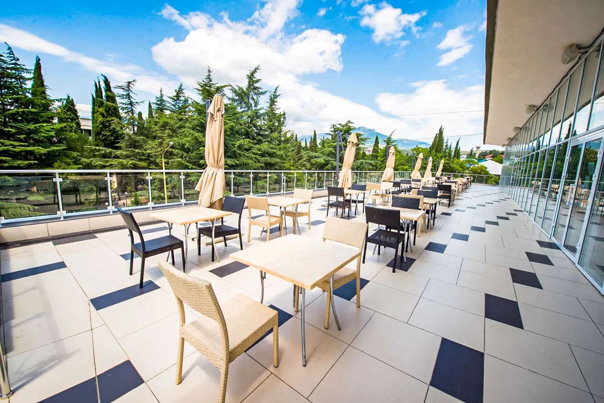 Санаторий «Славутич» в Алуште – шикарный санаторий с питанием, организованным на базе модного ресторана. В санатории еще есть лобби-бар, фито-бар, кафе на территории бассейна. Также действует доставка еды в номер от ресторана «Библиотека».