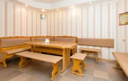 Вся еда приготовлена из качественных, натуральных, свежих продуктов без использования промышленных полуфабрикатов. Фиксированного времени для питания нет, поесть можно в любое удобное время, или сделать заказ в номер или сауну.