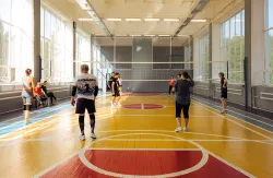 - Посещением спортивного зала, который идеально подходит для занятий подвижными видами спорта. В спортивном зале проводятся соревнования по волейболу, баскетболу и прочим командным видам спорта. В спортивном зале проводятся также и групповые тренировки по аэробике, фитнесу, йоге.