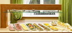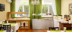 Питание по системе «Шведский стол» предполагает большую свободу выбора блюд и разнообразных напитков. Меню ежедневно обновляется, предлагается большой ассортимент завтраков, первых и вторых блюд, салатов и оригинальных закусок, десертов, напитков. Предлагается шикарный выбор крымских овощей и фруктов.