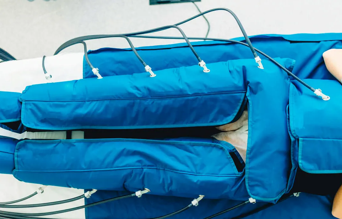 - Прессотерапия. Массаж, который проводится с помощью сжатого воздуха. Устраняет варикоз и дряблость кожи, разгоняет лимфоток, укрепляет стенки сосудов и суставы. Процедура дает дренажный эффект, преображает силуэт, избавляет от тяжести в конечностях, предотвращает появление тромбоза.