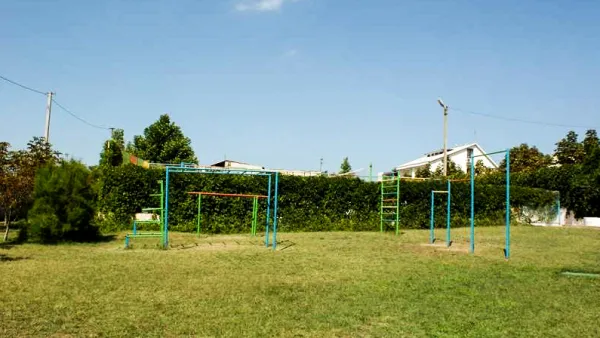 Территория пансионата большая и охраняемая. Впечатляют шикарные насаждения сосен. Также на территории базы отдыха есть спортплощадка, стадион для игры в футбол, современная детская площадка и паровозик для малышей.