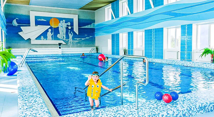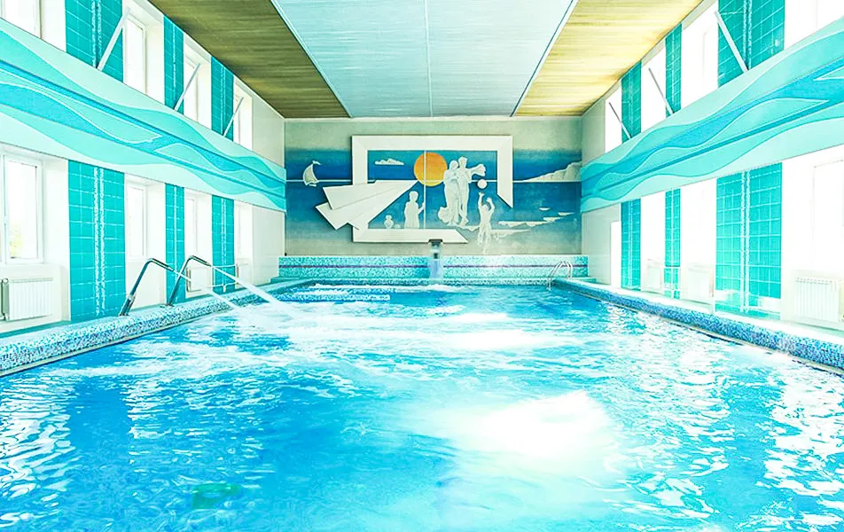 - Бассейны. В пансионате есть летний бассейн с подогревом и детской зоной, а также крытый бассейн площадью 160 кв.м. с плавным спуском и удобными поручнями, функциями «Водопад» и «Гейзер», системой аэрации для эффекта жемчужной ванны и подводное ложе. Минеральная вода прогревается до +27-29°С.