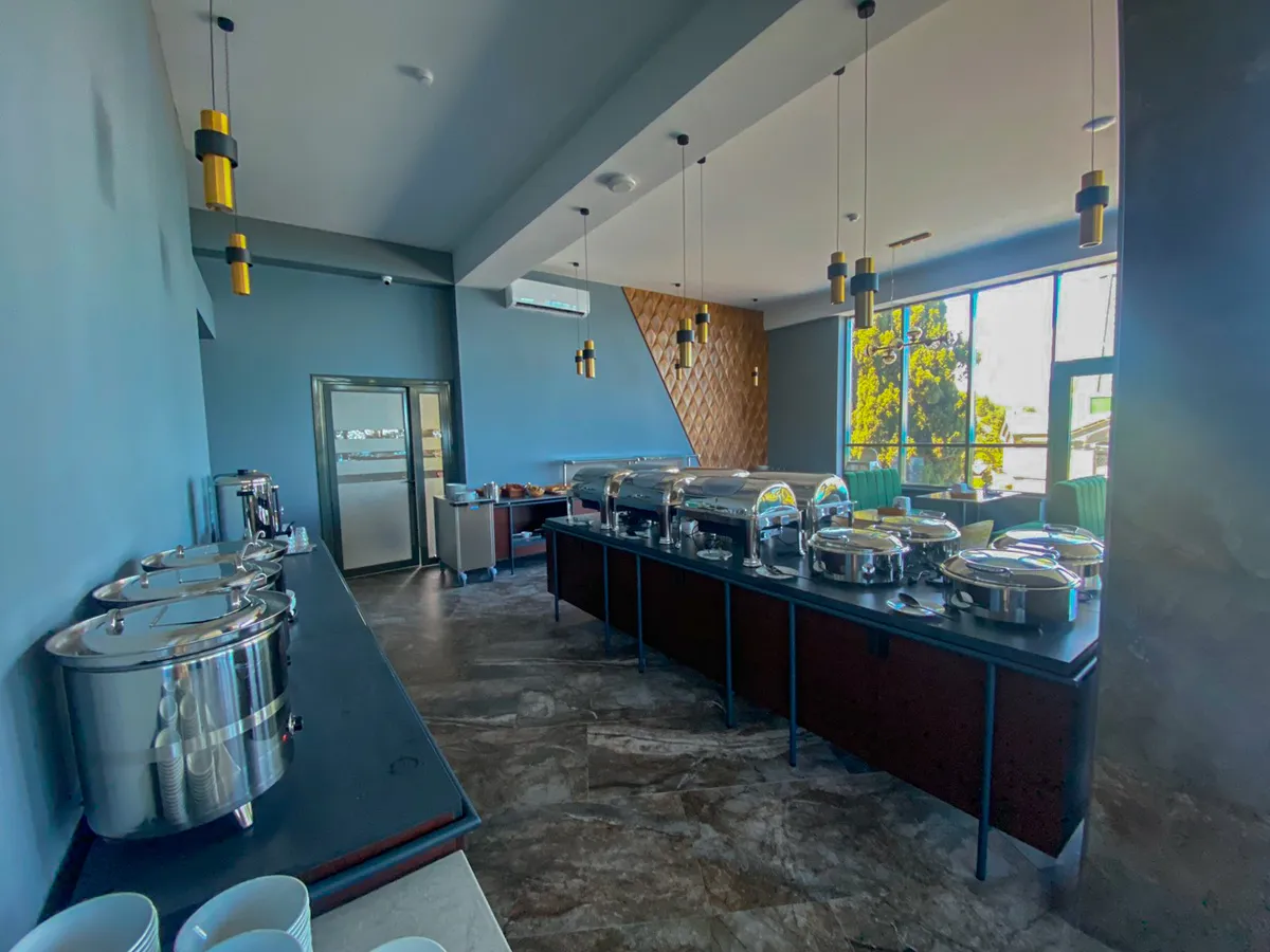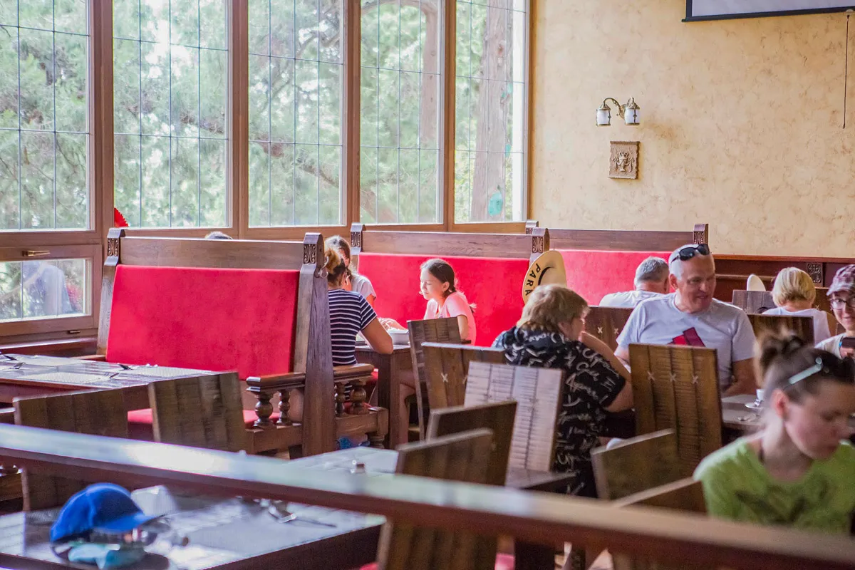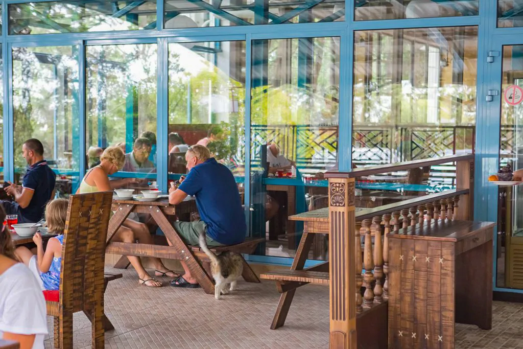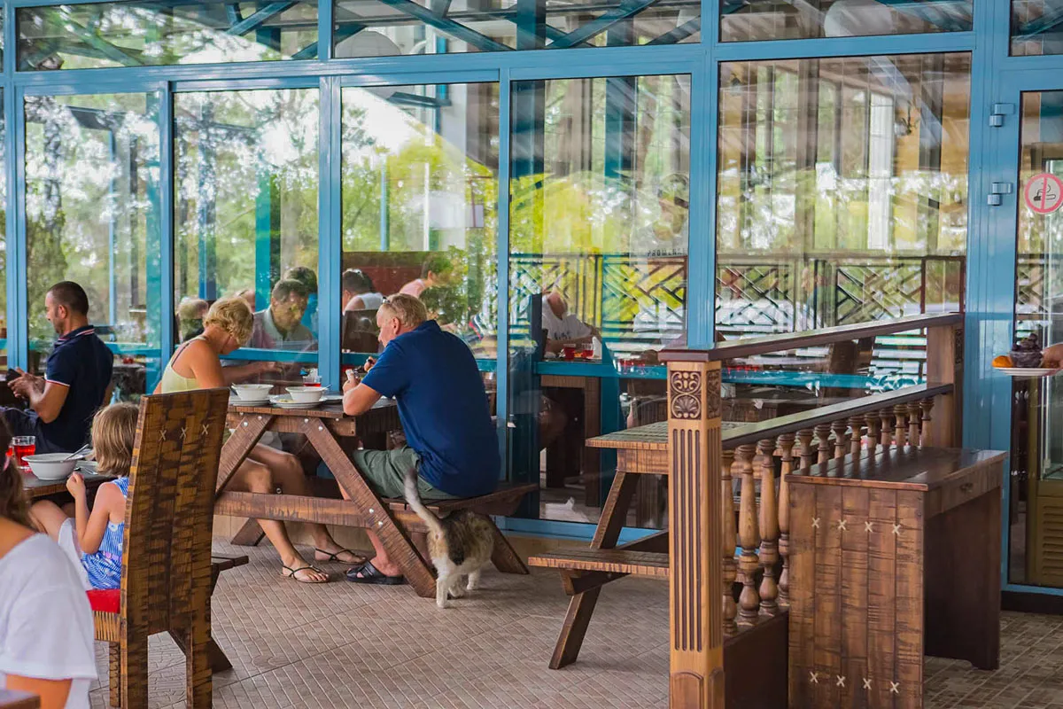 Просторная светлая столовая располагается на небольшом расстоянии от всех корпусов, что позволяет быстро и комфортно добираться на завтрак, обед и ужин. Здесь уделяют особое внимание свежести не только продуктов, но и предлагаемых позиций. Блюда изготавливаются из сырья местных производителей и никогда не идут в переработку для приготовления другой еды.