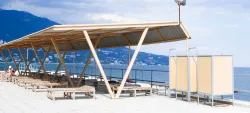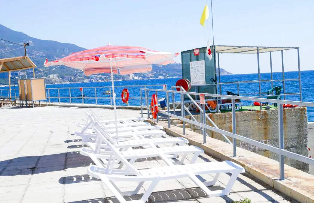 На пляж гостей санатория возит регулярно микроавтобус. Пляж оборудован навесами и лежаками, есть раздевалки, душ, туалет. Оборудован спасательный пост.