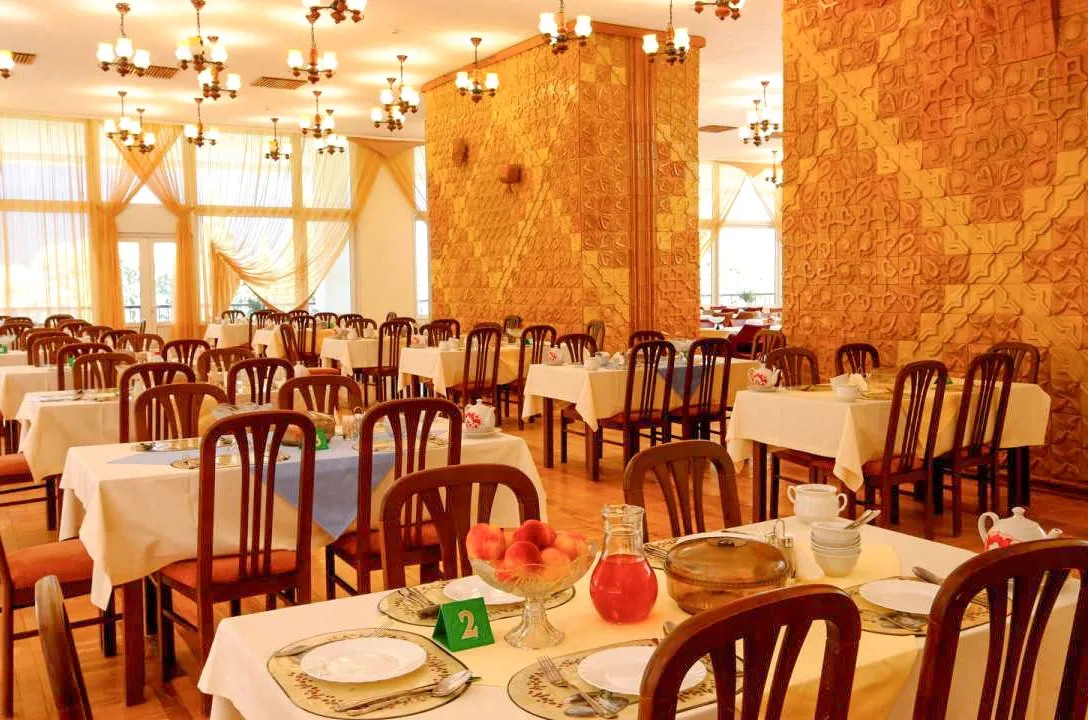 Столовая в санатории расположена в отдельно стоящем здании. Столовая имеет стильный интерьер, удобную мебель. Здесь царит приятная атмосфера, а сотрудники столовой всегда рады гостям.