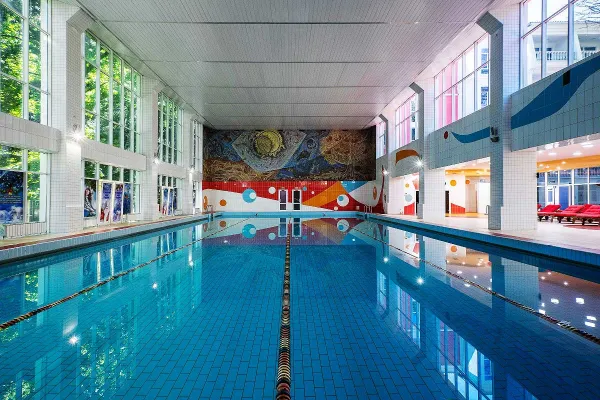 В здравнице имеется два бассейна. В акватермальном комплексе с октября по май работает зимний крытый резервуар с дорожками длиной 25 метров. Он дополнен опцией джакузи, финской сауной и турецким хамамом. В летний сезон функционирует открытый бассейн, который является одним из самых больших в Сочи! В подогреваемой чаше ежедневно проводятся занятия по аквааэробике и игры в водное поло. Рядом со всеми бассейнами располагаются шезлонги, душевые кабинки и раздевалки, а на солнечной территории предусмотрены еще и зонтики.
